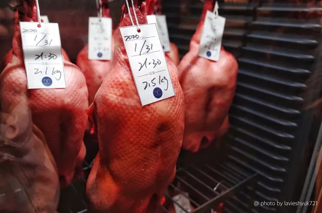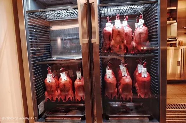 使人停下腳步定睛細看的乾式熟成冰箱,滿滿的擺掛來自彰化的胭脂鴨,詳記日期、時間、重量。