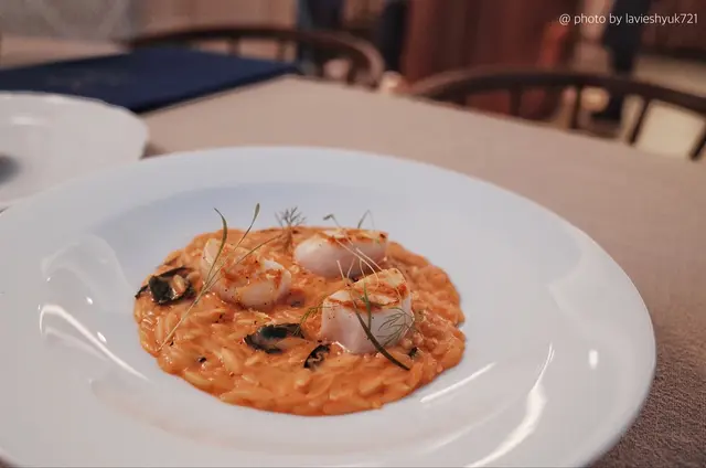 第一口就讓我愛不釋手的風味。以香草高湯煮米型麵至八分熟,拌入馬糞海膽及自製蕃茄醬,讓米型麵充分吸收醬汁,海膽及香煎北海道生食級干貝的鮮甜,充分呼應甘美濃郁的米型麵,日本柚子汁酸甜提味,馬告悄悄竄出清新檸檬香氣,茴香花的清香,層次分明。