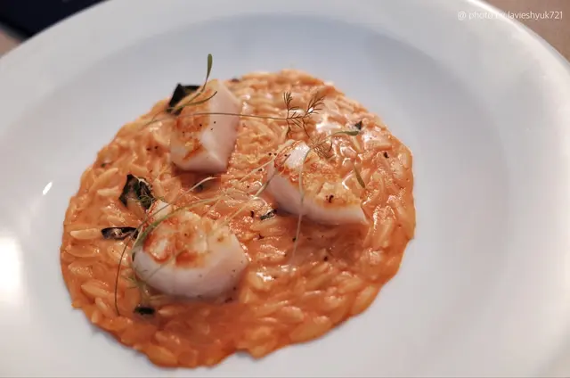 干貝表層略帶焦氣,極其軟嫩,充滿令人著迷的海潮味,整體嚐起來酸香清爽又開胃。