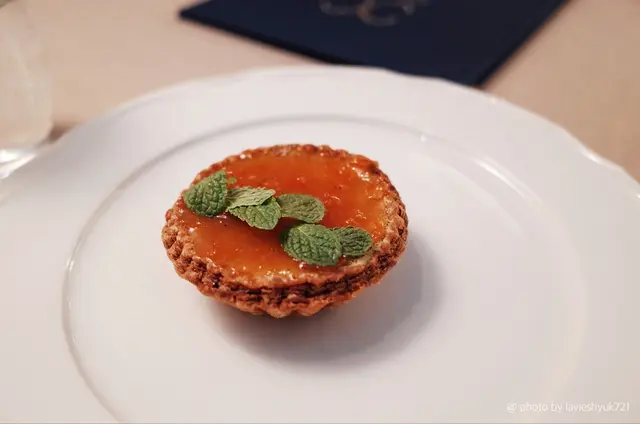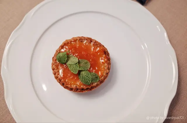 融入港式蛋塔概念,自製千層葡式蛋塔酥皮中填入鴨肝卡士達醬、香料金棗醬,表面綴以翠綠薄荷葉,咬下的蓬鬆與脆酥皮口感細緻,綿香鵝肝醬融合金棗酸甜,軟滑的口感獨特難忘,這是我第一次吃到。