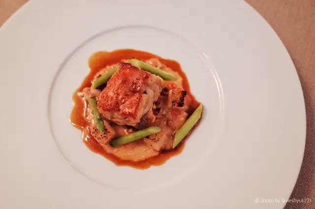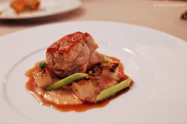小牛胸腺是用三至六個月未斷奶的小牛內臟腺體,開始吃草就會慢慢消失。先以牛奶浸泡,再以高湯川燙約三分熟後,下鍋煎到表皮金黃酥脆,內裡約七分熟,呈現粉嫩色,口感介於鴨肝與豆腐之間柔軟化口,極其軟嫩!!帶有特殊香氣,佐以牛骨、大量蔬菜及牛肉燉煮二日的濃郁牛骨醬汁、香濃的培根奶油醬,以煎過的清甜水梨、蘆筍為配菜,扮演清爽平衡的角色。