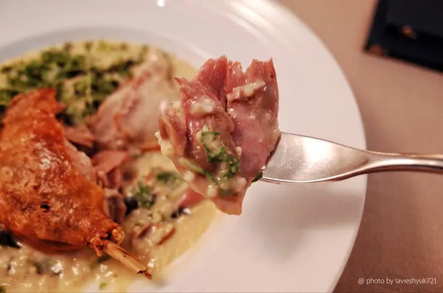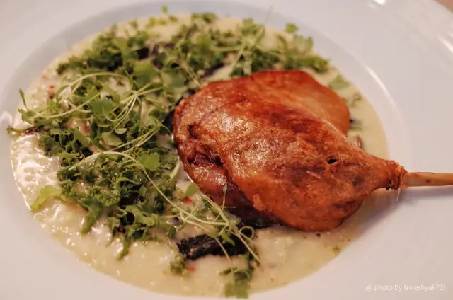 源自法國西南部的油封鴨是經典法國料理代表之一,原為在無冷藏設備時保存食物的料理方式。選用宜蘭豪野鴨,以各式香料醃製12小時,再使用自製鴨油油封低溫慢烤12小時,煎至表皮酥香後上桌。