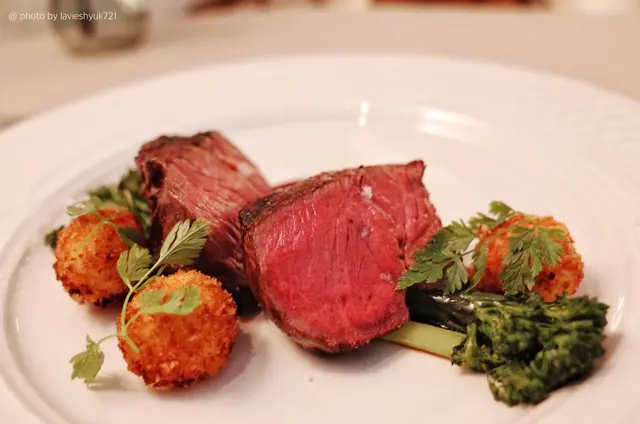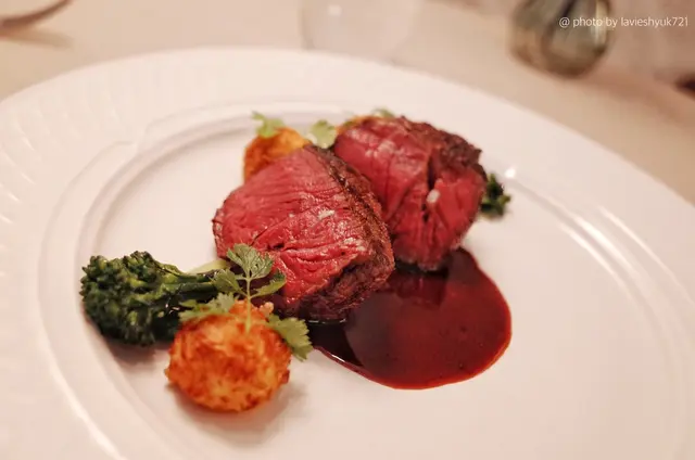 我們的午間套餐另以$400可加點一道菜,當然是選主餐比較划算,於是選擇了澳洲菲力牛排,以直火碳烤至三分熟,保有表皮焦香、肉質呈現誘人的寶石紅,醬汁以牛肉汁加入咖啡豆慢煮淬煉,特有的咖啡苦甜焦香正與炭烤牛排的煙燻香氣呼應,佐水果玉米融合馬鈴薯泥、鮮奶油、萊姆製成的香甜酥炸玉米球、烤青花筍。