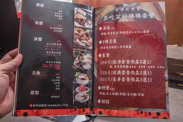 紅九九個人鴛鴦鍋-延吉店的菜單,以套餐形式供應,每人低消320元,不能共鍋,可自由組合湯底、菜盤、拼盤、主食還包含甜點,基本湯底有麻辣、和風蔬菜、黃金養生三種,現在還有推出秘制火焰牛/豬湯底,也可以選擇鴛鴦鍋呢!另外麻辣鍋底鴨血豆腐都可以無限續加唷