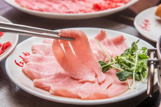 活菌松阪豬的肉色超粉嫩,肉上布滿均勻的油花,而且紅九九個人鴛鴦鍋是厚切處理,這樣吃起來口感更好更飽滿,涮煮到肉色轉白就可以吃囉,因為較厚,可以完全展現松阪豬紮實Q脆的口感,入口盡是滿滿鮮甜的肉汁,好吃!