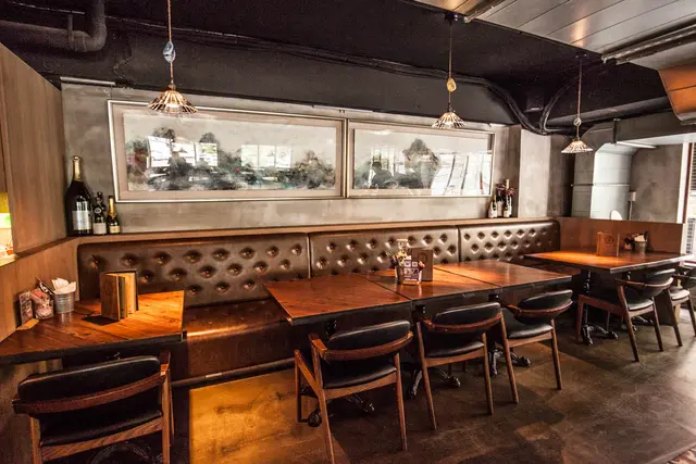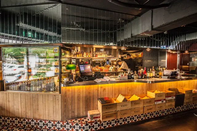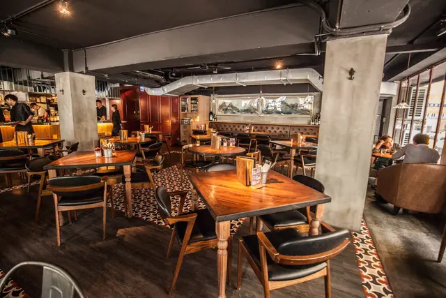 走進好米亞餐酒館,印如眼簾的是充滿英倫風的用餐環境,沉穩的深色系裝潢,搭配水泥牆及木質餐桌及皮沙發,沉穩中又帶著優閒放鬆的氛圍,咬咬注意到地板,是木地板與彩繪地磚的混搭,很有時尚個性