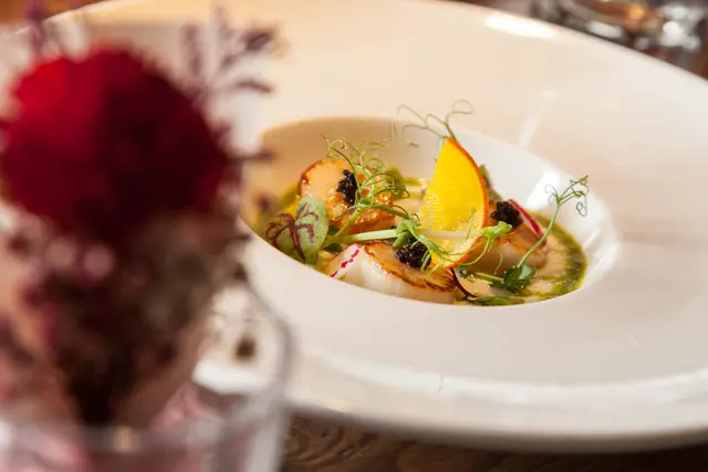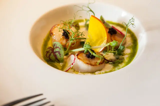 好菜上桌!來餐酒館用餐頭盤當然是來份開胃菜來開開胃囉!好米亞餐酒館使用生食級的北海道大干貝,搭配自製的花椰菜醬,擺盤看起來就像個繽紛小花園似的