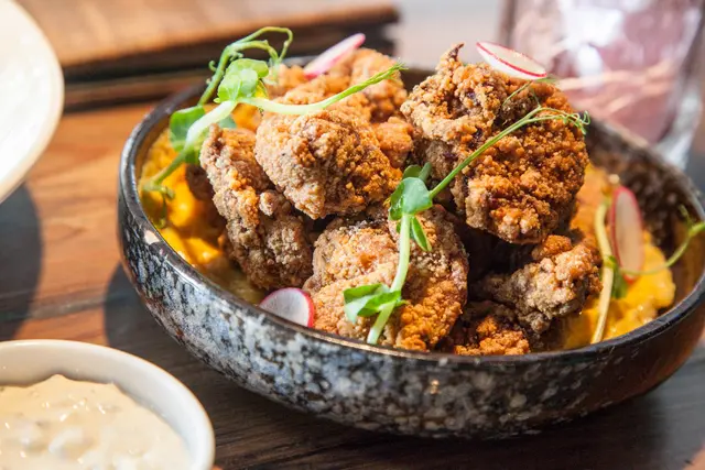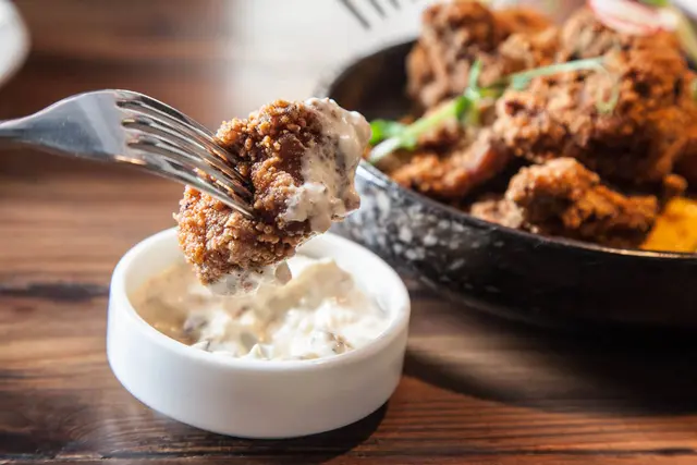 厲害的來了!附的醬料可是會讓你出乎意料,是用茶葉蛋做的塔塔醬,熟悉的茶葉蛋香與甜香塔塔醬完美融合,伴著炸雞一起入口,形容不出的好味道!