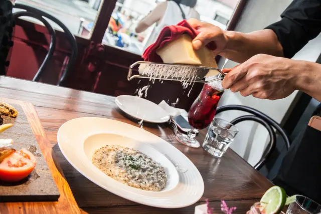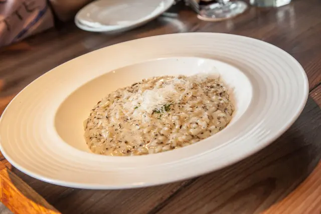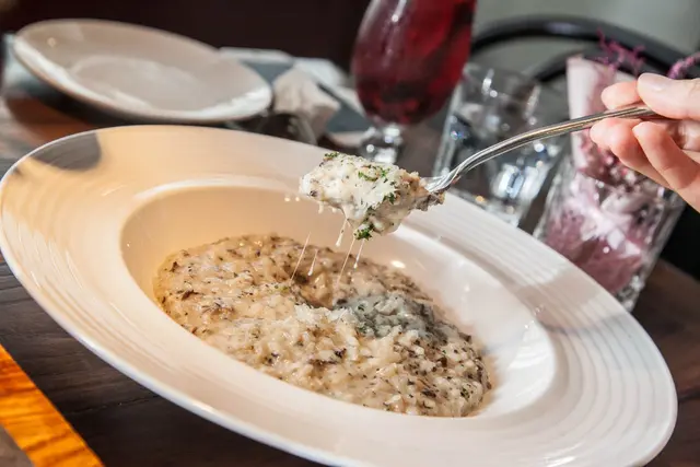 勺起一杓松露野菇奶油燉飯,冒著裊裊香煙,米飯間還牽起細細起司絲,送入口中濃郁的野菇香氣在口中釋放,伴著濃郁的溫潤奶醬燉飯,幸福滿足感油然而生