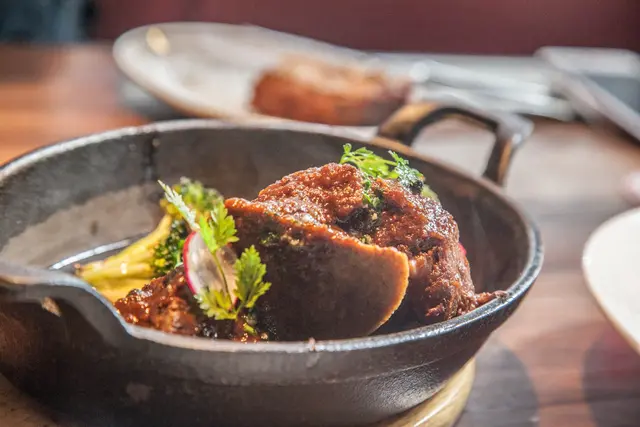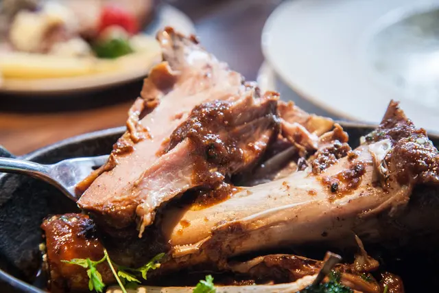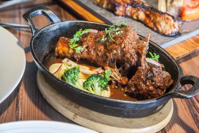 極其費工的一道功夫菜!紅酒燉嚴選小牛膝製作過程中不加任何一滴水,只有紅酒與焦糖洋蔥燉煮