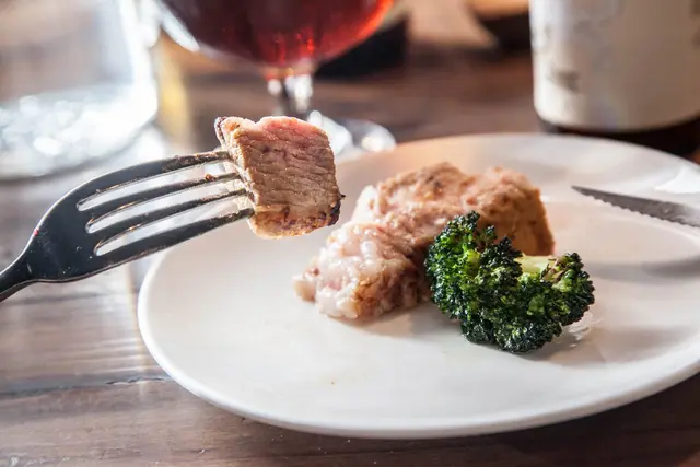 一刀切下,刀子毫不費地的話開出豬排,剖面透著粉嫩的肉色,纖維中還不斷的湧出肉汁!