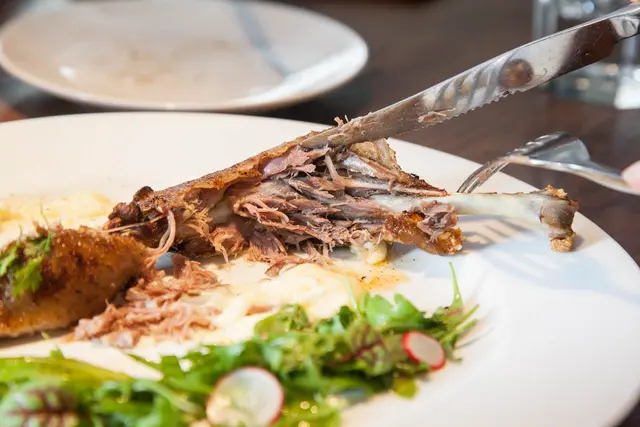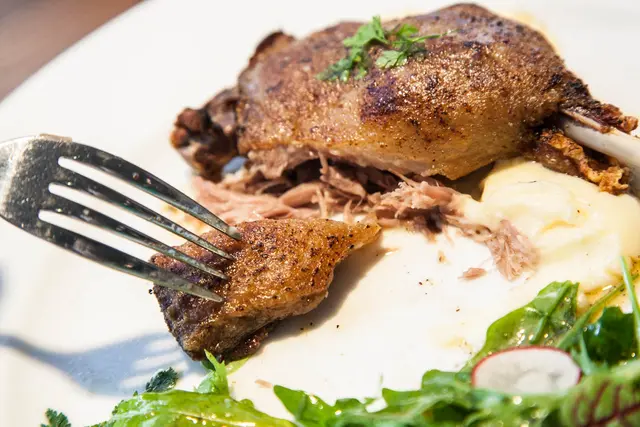 切下鴨肉,刀尖傳來不可思議的柔嫩感,幾乎不用費力鴨腿肉便骨肉分離