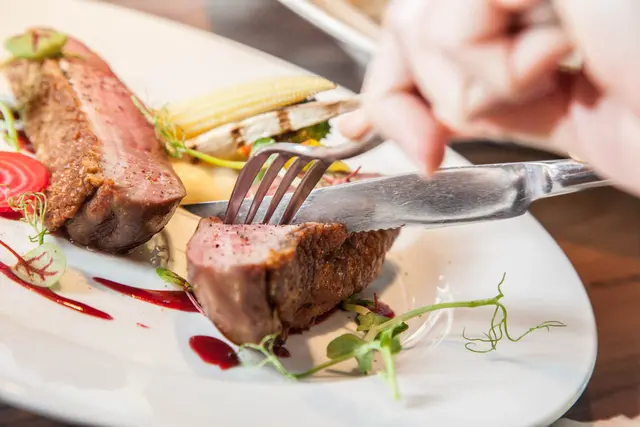 使用英國櫻桃谷品種櫻桃鴨胸,搭配主廚特製的波特酒莓果醬,鴨胸是西式料理中常見的食材,但要做的好吃並不容易