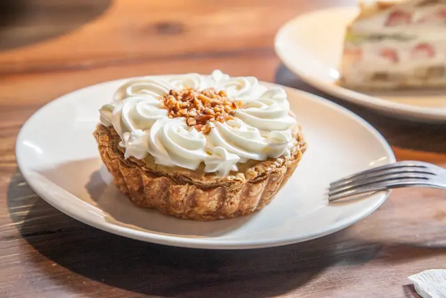 香蕉派是使用法國進口發酵奶油以及日本麵粉製作,將派皮烤至酥鬆層層分明,加上自製卡士達醬,裡面再層層堆疊上香蕉片,香甜的卡士達醬加上Q軟甜蜜的香蕉,外層的酥脆派皮恰好中和內餡的甜味,口感平衡完美!