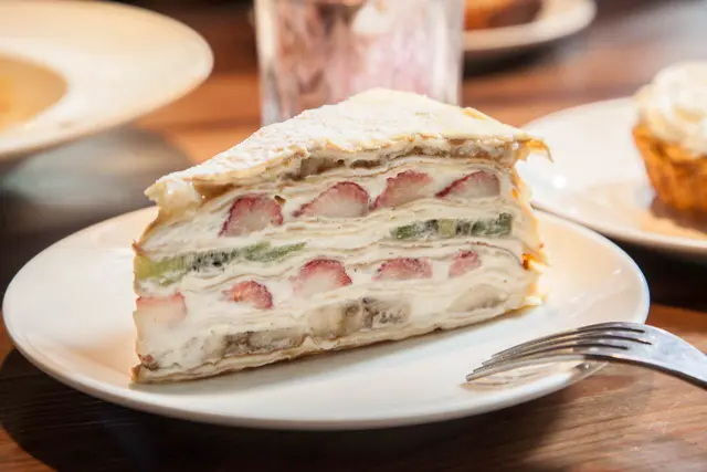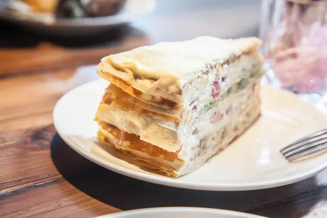 水果千層蛋糕是今年推出的甜點狠角色!薄到可透光的層層蛋皮是主廚一片一片煎製出來的,口感柔嫩又有濃郁的蛋奶香,夾上手工製作的清爽幕斯林奶油醬內餡及新鮮水果,足足要堆疊至20層,蛋奶香伴著新鮮水果的酸甜,滿滿的幸福感!因為做工繁複,每日限量推出,有幸遇到它可千萬別放過