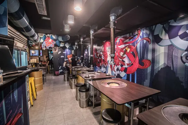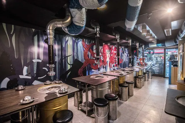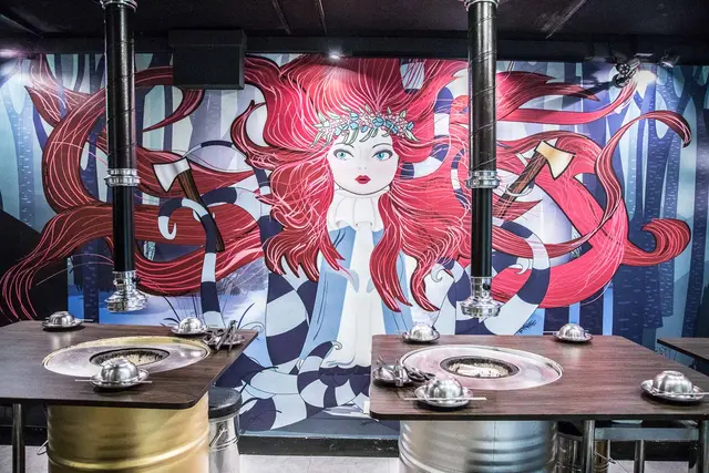 走進燒桶子,店內牆上有彩色繽紛的壁畫,主題設計概念來自童話故事金斧頭銀斧頭的故事,正中央最大的壁畫是湖中女神,另一邊則是弄丟斧頭的樵夫,仔細看湖中女神的造型讓您聯想到什麼呢?對!就是韓式料理中常見的海鮮食材:章魚
