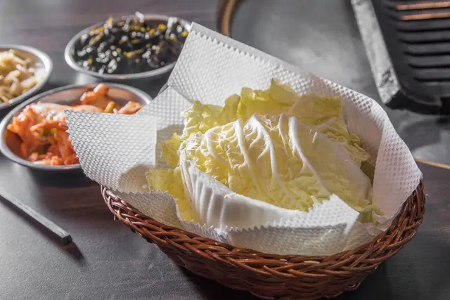 還有一吃就是類似溫沙拉的吃法,將大白菜放在烤盤上稍微烤軟,再放上豬五花跟喜歡的小菜,烤過的大白菜溫溫熱熱還有水分,搭配豬五花吃起來更加濕潤多汁,好吃