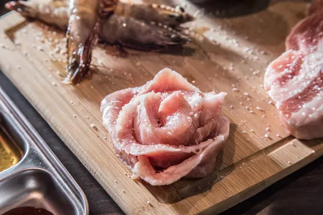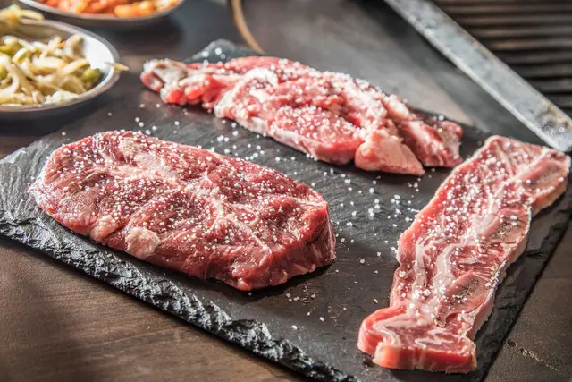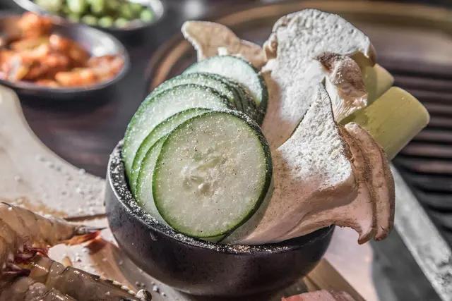 最吸睛的應該就是那塊超厚的經典韓式豬五花了,肥瘦相間,脂肪部分呈現雪白色,頂級黃金松阪豬則是排成花朵的形狀,深海大花蝦也是平常不太容易看到的蝦種,肉類上都會灑上些許的鹽花提鮮