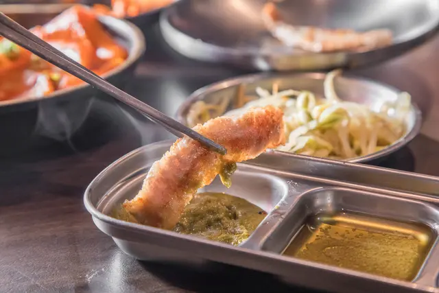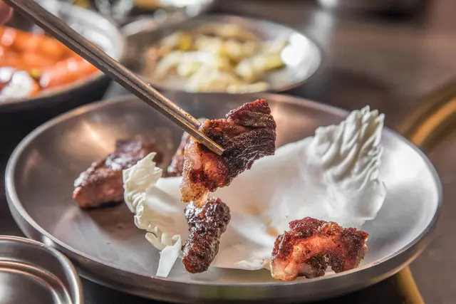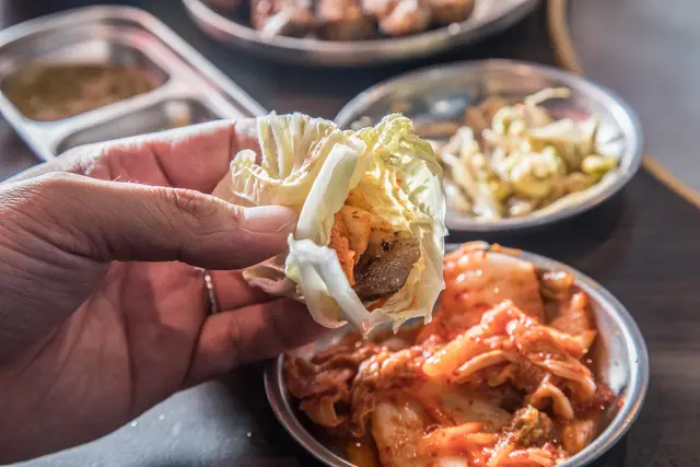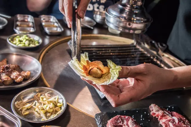 吃韓式烤肉就是要包生菜囉,光靠包生菜就吃掉好幾塊豬五花,酸香泡菜跟豬五花超搭,微微的辣度,點上一點濃醇的韓式辣醬,包起生菜一口咬下,口感清爽,吃再多都不膩!