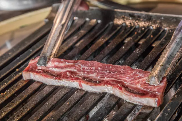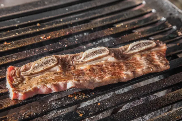 先烤的是帶骨牛小排,牛小排一直都是咬咬最喜歡的部位,大理石紋油花多且分布均勻,一放上石板就激出濃郁的油脂香氣