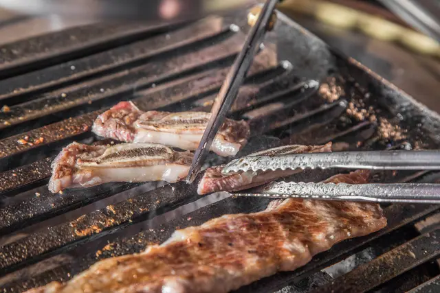 開烤囉!燒桶子韓風立燒是採服務人員桌邊代烤服務,客人們只要動口就可以啦,因為經典韓式豬五花要考比較久,所以一開始先將經典韓式豬五花放下去烤,旁邊烤的是頂級黃金松阪豬,值得一提的是燒桶子韓風立燒使用的是炭爐唷