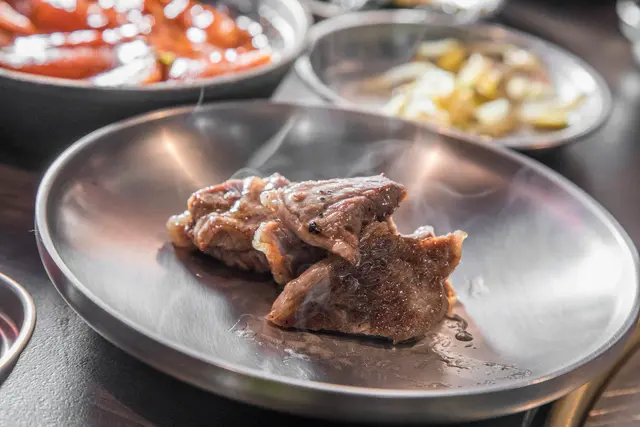 夾起一塊牛小排放入口中,甜美的油脂感及焦香的牛肉香氣充斥口中,當咀嚼時,油脂香味混著甘甜肉汁不斷的在口中奔流釋放,鮮嫩多汁的口感,我都快溶化惹!
