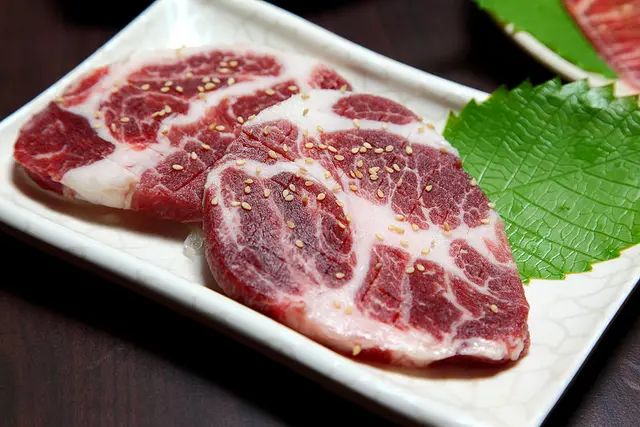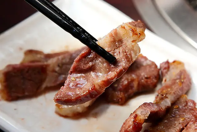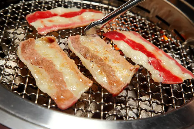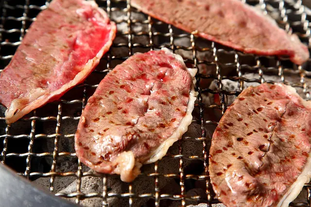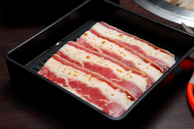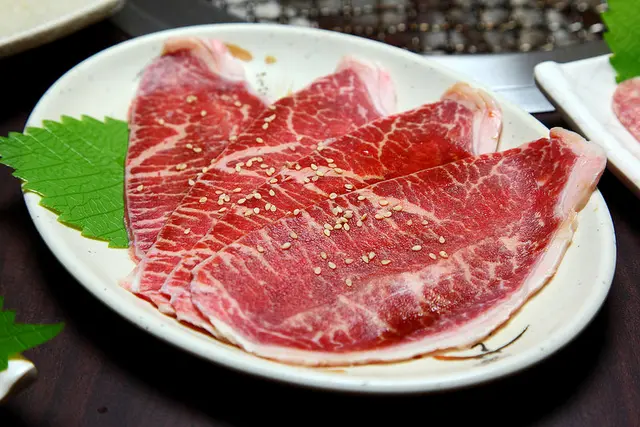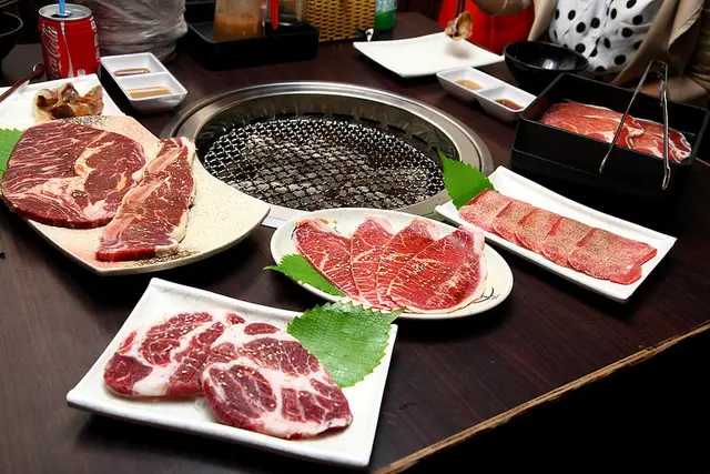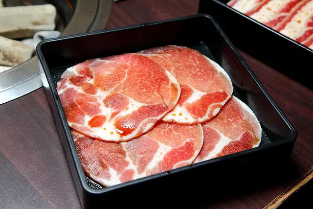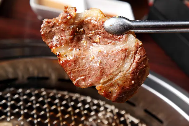 燒肉眾使用的是梅花部位,油花分布均勻,烤到白裡透紅的七分熟為最佳熟度!可加上一些洋蔥絲一起烤