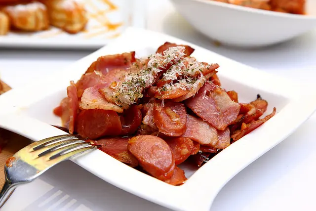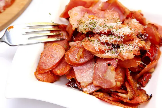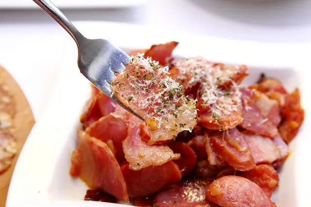 培根、德式香腸、乾辣椒、蒜頭加入辣橄欖油一同拌炒,微辣的口感是相當下酒的餐食