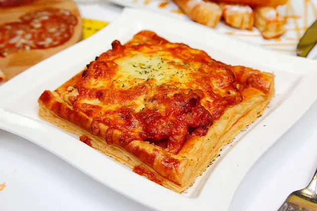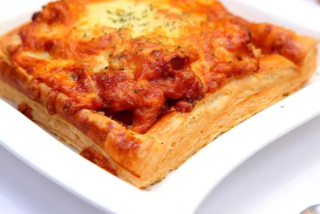 特製的酥皮盒中加了大量的起士跟番茄肉醬做成的千層麵,再送進烤箱烘烤