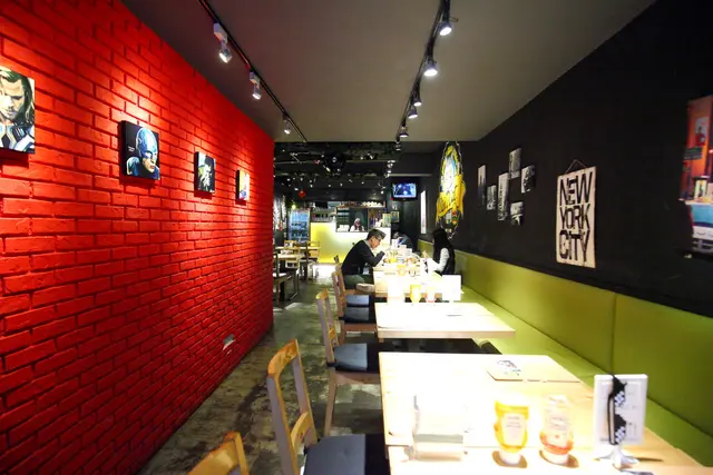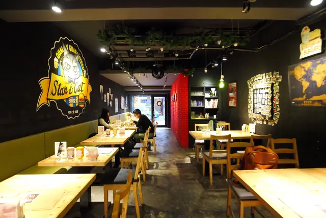 Stan&Cat 史丹貓美式餐廳的用餐空間雖然不大,但許多小細節都十分用心,左手邊是一面紅牆,上面有復仇者聯盟的圖畫,右邊則是一整排沙發用餐區,這樣的設計坐起來相當舒適,如果多人用餐還可以併桌,牆上也有Stan&Cat 史丹貓美式餐廳的彩繪LOGO貓咪