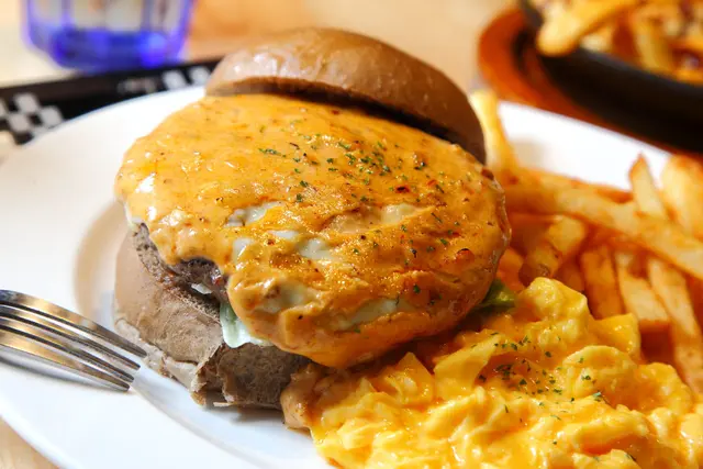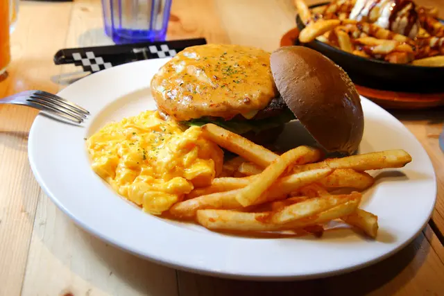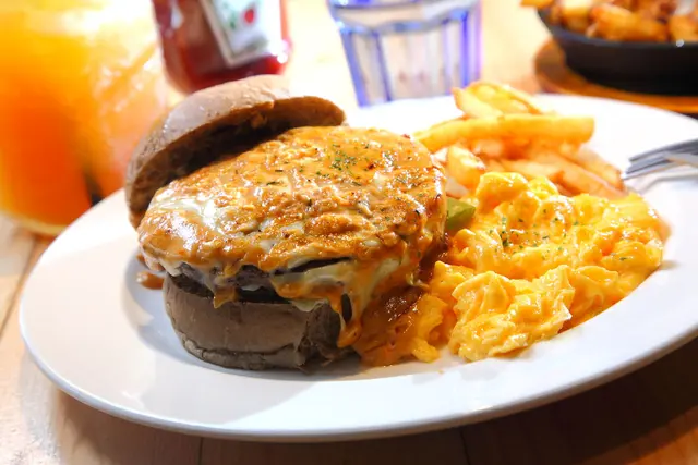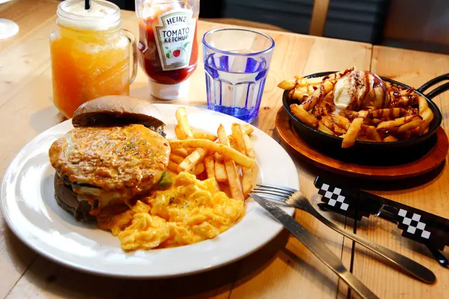 咬咬原本想要點”天呀好大起司牛肉堡”,不過不知道為什麼腦海中突然迴盪起卡通海綿寶寶蟹堡的的畫面,就點了這看似衝突感十足的辣味蟹肉醬起司牛肉堡,點選漢堡可以挑選兩樣配菜(現炸薯條、調味薯格、黃金薯塊、培根馬鈴薯泥、有機炒蛋)吃漢堡一定要配薯條的呀,所以我選了現炸薯條跟有機炒蛋