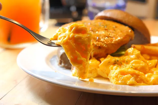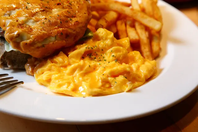 現炸薯條熱呼呼的,吃起來外酥內鬆軟,還有香甜的馬鈴薯香氣,不過最令咬咬驚豔的還是這個有機炒蛋,看起來就像軟嫩的歐姆蛋一樣,半熟滑嫩,更過份的是上面還加了起司,濃郁的起司更增添炒蛋的層次味道