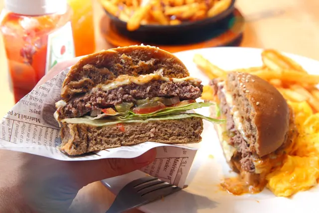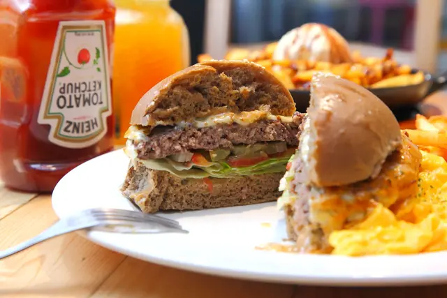 Stan&Cat 史丹貓美式餐廳的漢堡麵包也很特別,特別選用黑裸麥麵包,因為美式漢堡的口味較重,黑裸麥麵包有種特別的香氣及甜度,可以讓整個漢堡口感吃起來更加圓潤有深度,在澳洲牛肉堡上加上特製的蟹肉醬,蟹肉醬有用美乃滋及洋蔥調和,所以除了濃郁的蟹鮮味外,還帶有美乃滋及洋蔥溫潤的甜味
