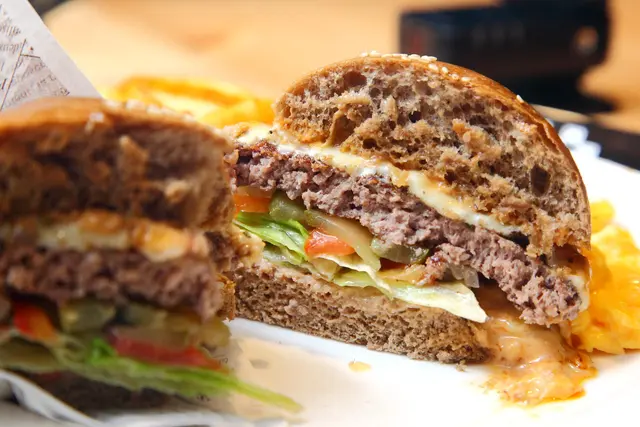剖面圖,是不是相當的誘人呀!黑裸麥漢堡麵包有不小不均的氣孔,吃起來口感相當鬆軟,牛肉厚度也相當厚,切面肉汁橫流,上面還蓋著一片半融的瑞士起司!