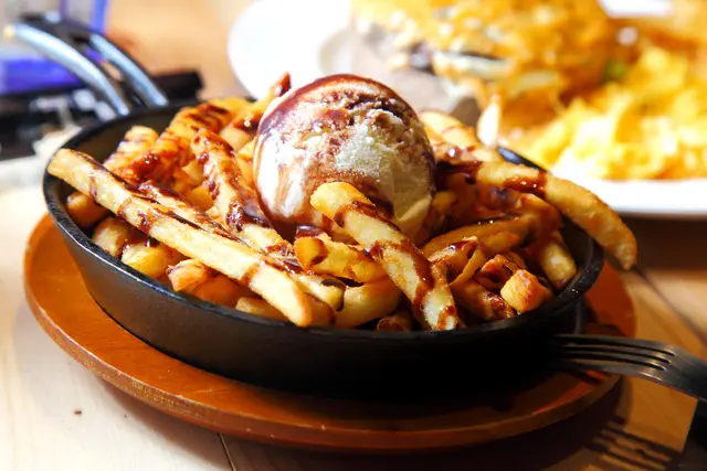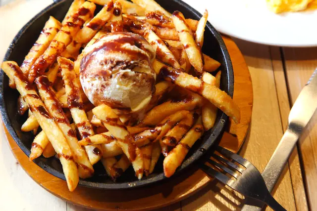 鐵鍋裡放了滿滿的現炸薯條,中間放了一球香草冰淇淋,然後再淋上超邪惡的巧克力醬!
