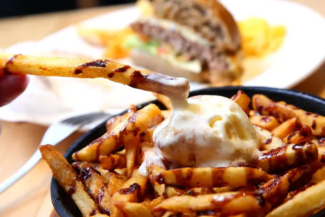 這時候沒有人再管熱量了啦!先吃再說!薯條酥脆的金黃外皮咬下去後濃郁的馬鈴薯香氣四溢,搭配微甜的巧克力醬甜鹹甜鹹還蠻搭的,趁熱拿起薯條直接往香草冰淇淋”戳”下去,香草冰淇淋的甜味與薯條的鹹味所形成的強烈對比,既奇妙又美味的口感,超涮嘴的!