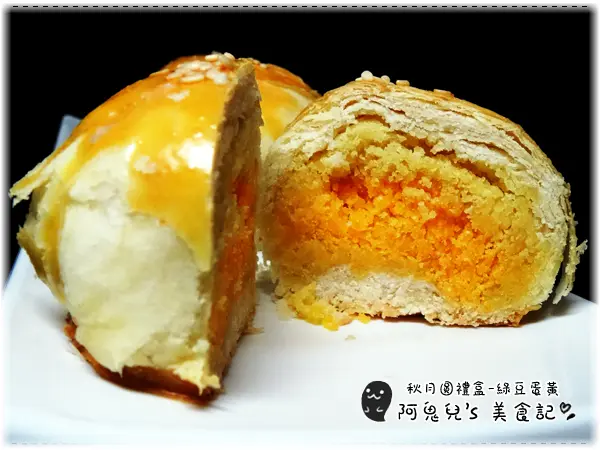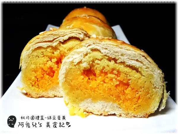 切開看到色系相近的綠豆沙及蛋黃幾乎快分不開了~內餡份量超多 綠豆蛋黃吃起來應該算是這四種口味中甜度最低的,顯得更加清爽