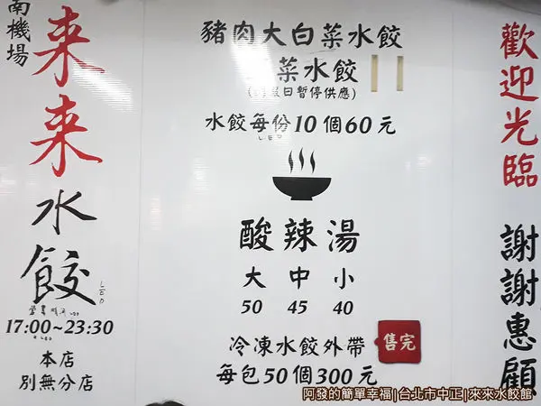 近二十年前,我和老婆還很年輕時,第一次造訪台北市著名的老字號美食夜市「南機場夜市」。當時有平面媒體以及不少人推薦,若來到這,一定要來吃這家「來來水餃館」,也因此,我們就造訪了它。