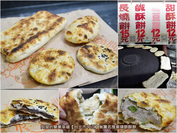 長燒餅15元、鹹酥餅12元、紅豆餅12元、甜酥餅12元。