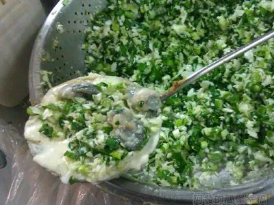 ▲看著店家在大湯瓢上杓上一層麵糊當底,再加入切碎的大量青菜及蔥末,最後用麵糊封好蚵嗲。