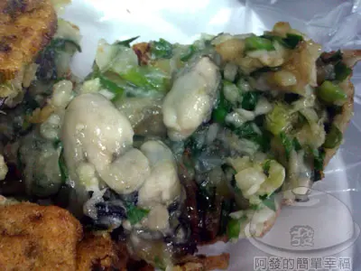 蚵嗲內餡主要有大量的高麗菜及青蔥末,蚵嗲外皮薄酥脆。一口咬下酥脆的外皮下,裏面卻是滿滿混和甘甜的高麗菜、獨特香氣的青蔥及軟嫩的