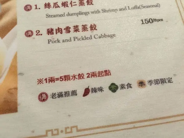 餡老滿的餃子是以2兩為單位,有別一般以顆為單位的算法,而1兩為5顆,2兩就是10顆,餃子在開始點的最少兩數限定為2兩起跳。