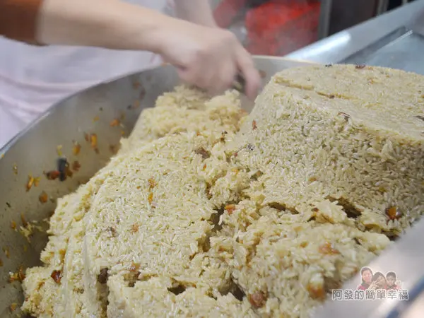 ▲在傳統的大金屬盆裏,裝著外觀光澤油亮油亮,且散發香氣十足等待裝盒的油飯
