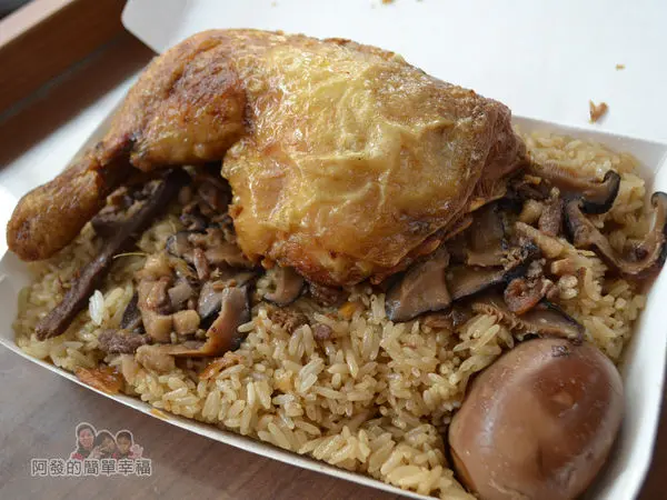 ▲油飯裝盒後,再放上店家選用上等豬肉所特製的滷香菇肉