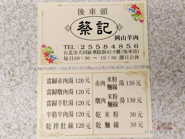 上回食記提到,在20多年前,當時的阿發和前女友還很年輕時,由於前女友工作地點的關係,有好幾年的時間,我們的早、晚餐就時常在台北後車站解決,特別是在華陰街上。而後車站的許多店面,至今早已不知更換了幾回,所以能撐過數十個年頭的,也絕對是有過人之處。像是福珍排骨酥麵、蔡記岡山羊肉、老牌牛肉麵、福元胡椒餅、芳林早餐…等。介紹過飄香25年「芳林早餐」的美味烤厚片後,這回再來介紹飄香40年的「蔡記岡山羊肉」。