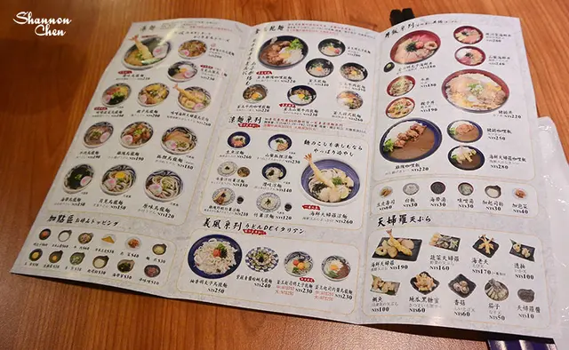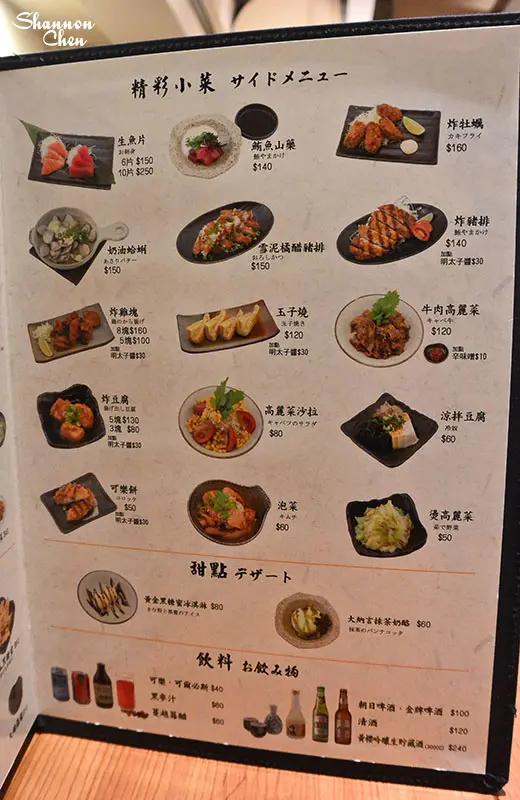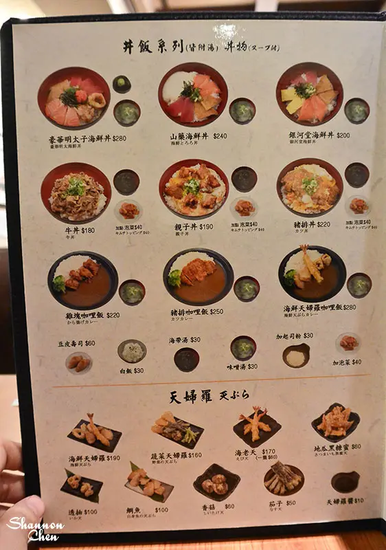 丼飯系列180~280、天婦羅10~190、小菜50~250、甜點60~80、飲品40~120