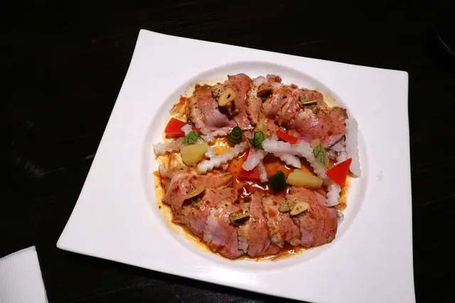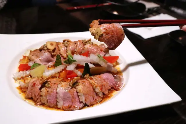 切成薄片狀的鴨肉,嫩口多汁不柴口,淡淡的辣香提升整個風味。