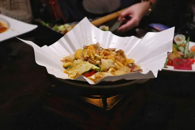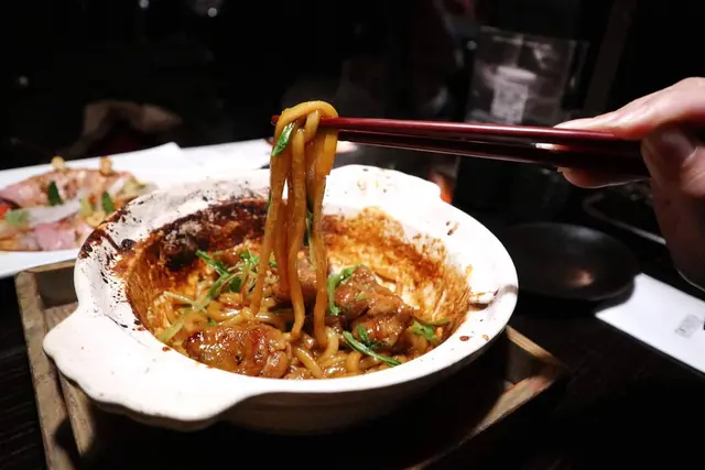 一送上來服務員就會幫忙攪伴,一攪伴不得了整個鹹香味兒飄散於鼻,入口跟聞起來的香氣一樣屬於重口味,烏龍麵Q彈咕溜,連同蔥一起入食更加香氣,雞腿肉嫩口飽滿,一整個土鍋燒超入味搭配白飯也很合理!