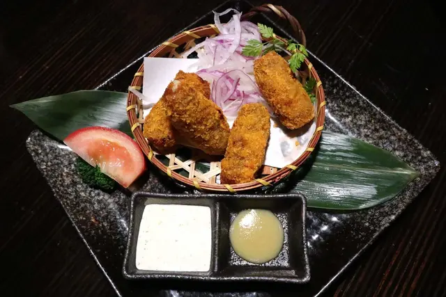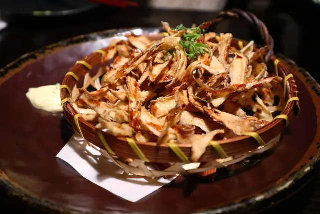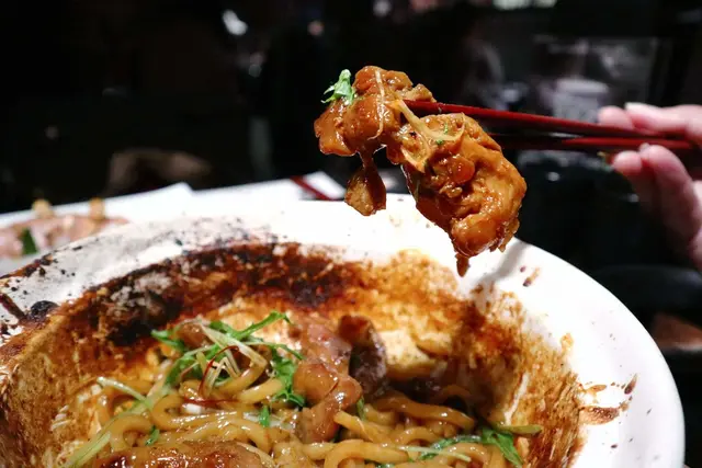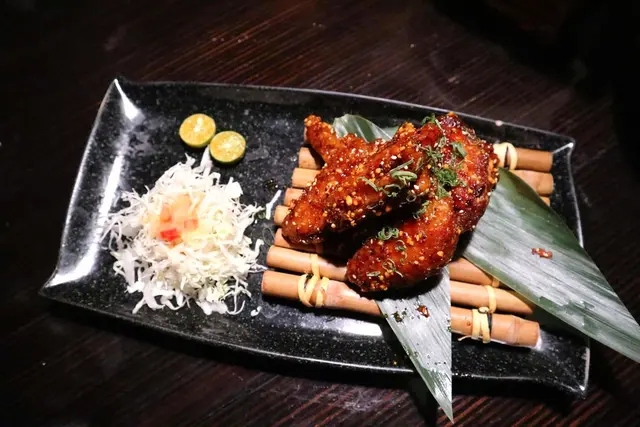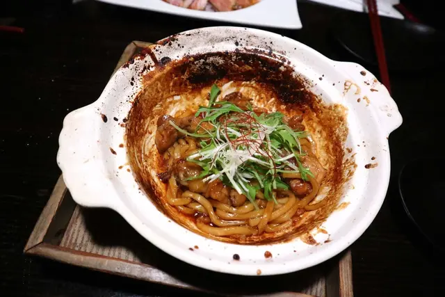炸的酥香的雞翅外衣塗上一層鹹香辣味噌醬,吃起來微酥充滿醬汁溼潤濃郁的香氣,雞肉細緻嫩口,非常涮嘴。