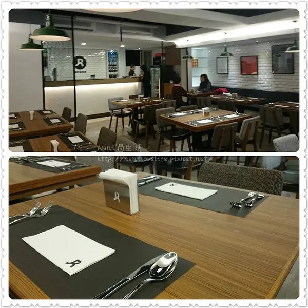 踏入店裡後迎面是寬敞的用餐環境,明亮卻不刺眼的光線,不會過度刻意的昏黃放鬆,又不感到壓迫感的光亮,在氣氛的拿捏洽到好處;擺設整齊的餐具及充滿代表餐廳的Logo「R」環繞在身邊,原因無它,因為是跑步及馬拉松促使這間店的產生,店名的Rest和Run皆是R開頭,這樣原因夠清楚了吧~說這裡是跑步餐廳一點也不為過!